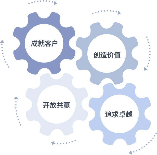 成就客户是一切决策的出发点,,,创造价值是衡量所有工作的标准,,,,追求卓越是我们做事做人的态度,,,,开放共赢是我们的格局也是最终的结果。。。。价值观的齿轮环环相扣,,,,推动着组织里的每个人不断向前。。。。